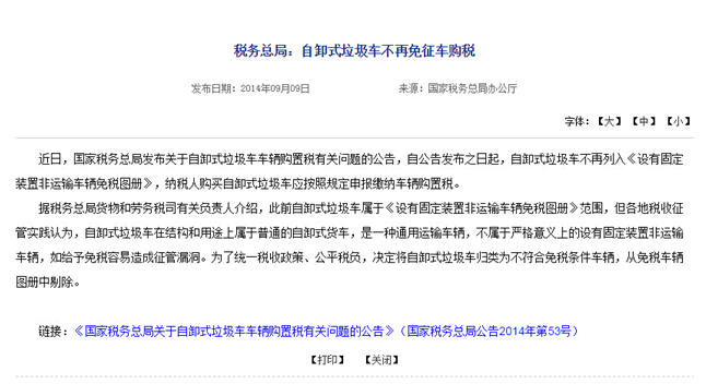 自2014年8月28日,國家稅務(wù)總局網(wǎng)站上刊登了《國家稅務(wù)總局(2014年)第53號公告:關(guān)于自卸式垃圾車車輛購置稅有關(guān)問題的公告》,自卸式垃圾車免稅公告取消。