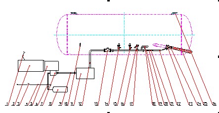 1.離合器踏板 2.發(fā)動(dòng)機(jī) 3.電開(kāi)關(guān) 4.電線 5.變速箱 6.電磁氣閥 7.取力器 8.儲(chǔ)氣筒 9.傳動(dòng)軸 10. 壓力表 11. 空壓機(jī) 12. 進(jìn)氣管 13. 21 止回閥 14、15、18、20.球閥 16.安全閥(0-0.3Mpa) 17.中小異徑三通 19.異徑外接頭 22. 蒸汽膠管23.蝶閥 24.二次吹氣總成 25.出料軟管 26. 卸壓管路
